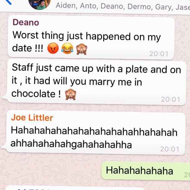 ▼Deano沒想到這是損友的惡作劇,還以為餐廳搞錯了,跟損友們訴苦說:「我約會時遇到了超尷尬的事!!!工作人員端上來一個盤子,上面用巧克力寫著『你願意嫁給我嗎』!」損友們哈哈大笑,這本來就是他們設計的~