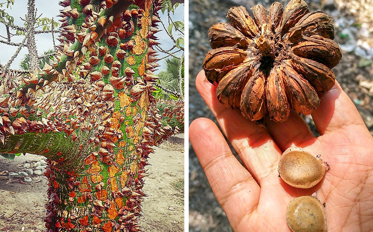 ▼2.沙盒樹(響盒子):種子成熟後會炸開,並彈射出去。沙盒樹的樹幹上有尖刺,葉子像菩提葉,果實像小南瓜。種子成熟後會炸開,發出響亮的聲音,並彈射到幾十公尺遠的地方。原生地為南北美洲熱帶地區。