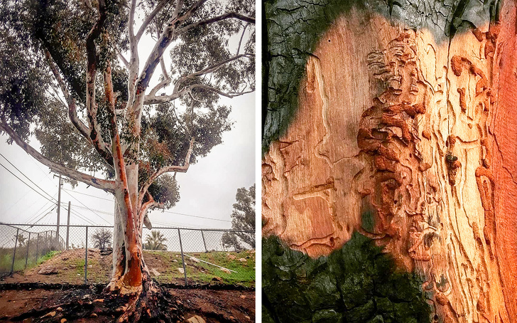 ▼8.桉樹(尤加利樹):葉子產生的桉油非常易燃,是造成山火的重要原因。大火使桉樹的種子開裂,從而得以生根發芽。桉樹本身耐火,燒焦的樹幹能夠再生。原生地為澳洲。