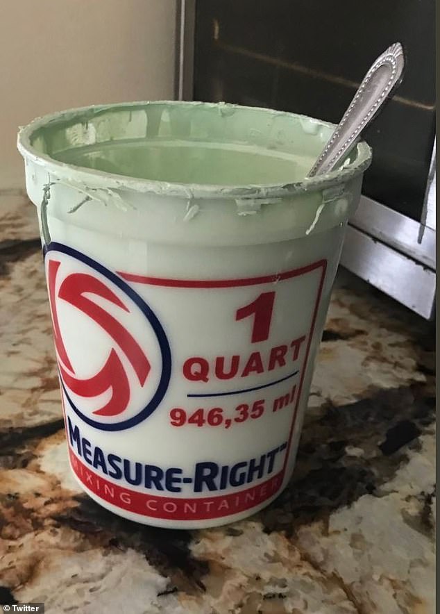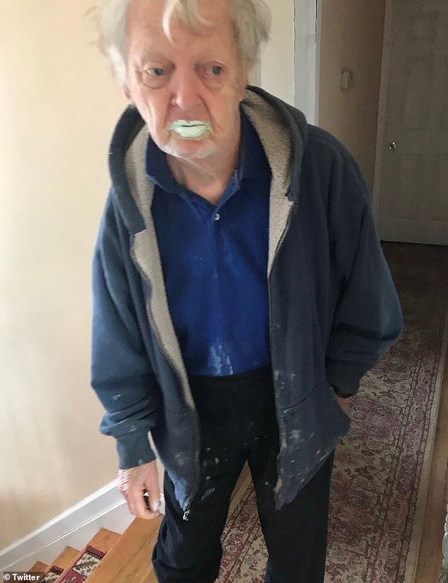 ▼爺爺嘴巴染著薄荷綠色油漆的模樣,以及那桶油漆的照片都被上傳到推特。