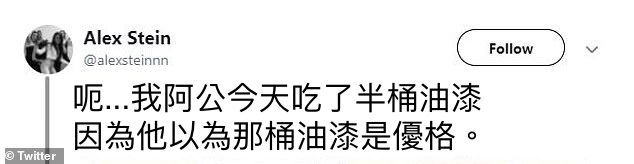 ▼網友Alex在推特上發文表示他爺爺吃了半桶油漆。