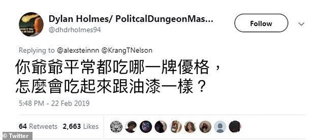 2019年02月26日推特(Twitter)上常有奇人奇事,美國紐約一名網友Alex Stein日前就發文,說家中油漆無故少了半桶,又見到他的爺爺Bobby唇邊染漆,才發現爺爺把油漆誤當成優格。Alex將爺爺滿嘴油漆的照片上傳,這則奇聞馬上引發數十萬網友瘋傳。