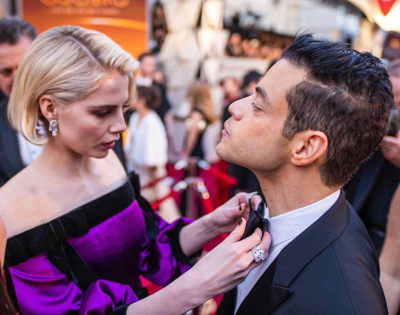▼其實從頒獎典禮到上台之前,明明已經有很多人幫他調整領結,其中包括他女友露西(Lucy Boynton)…