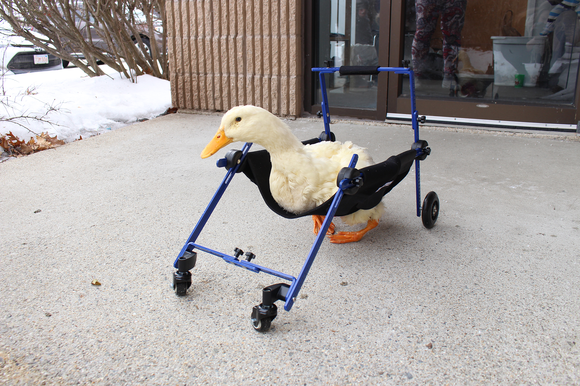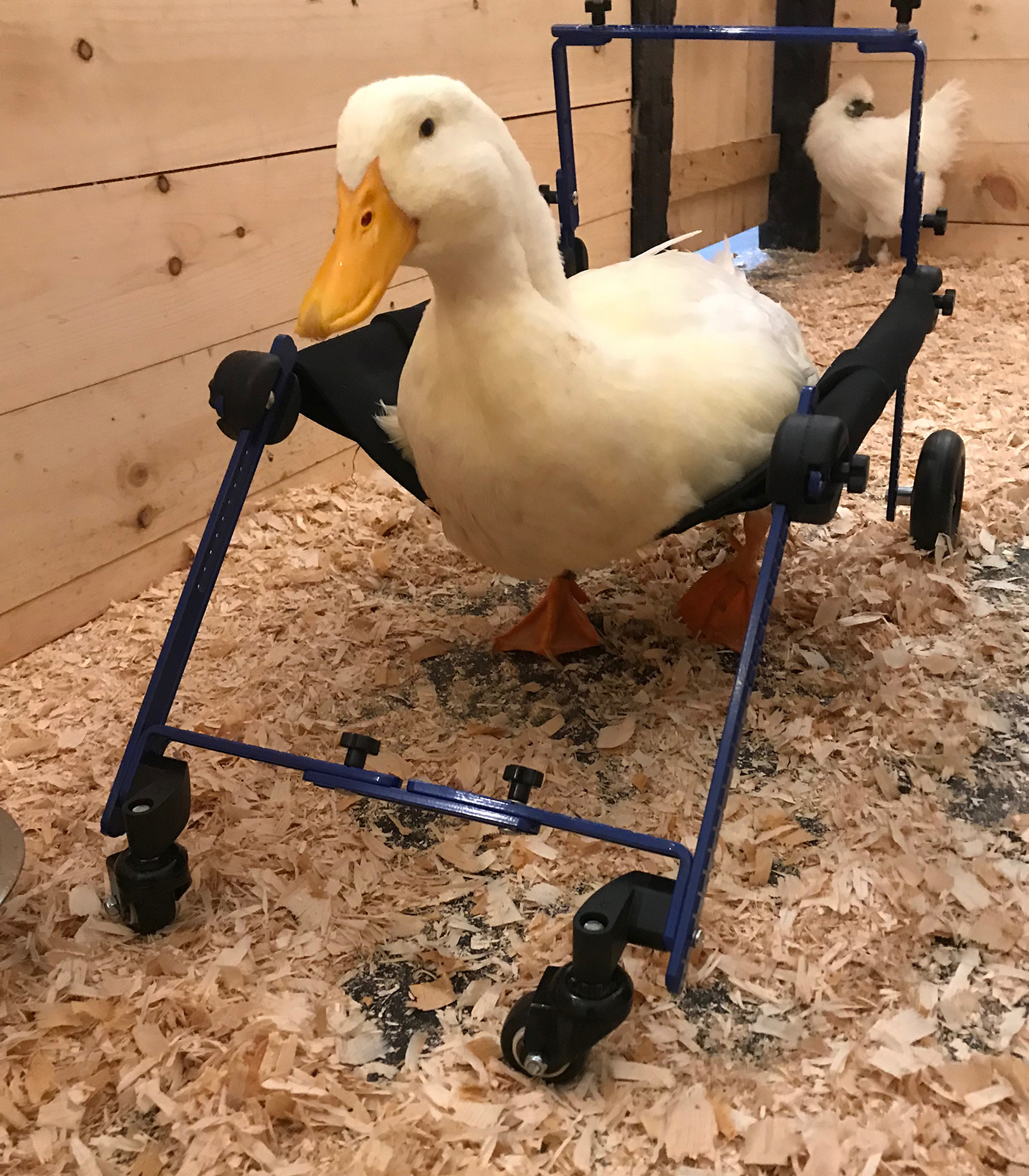 ▼總部位於新罕布什爾州阿姆赫斯特(Amherst)的「Walkin' Pets」,已經為世界各地的殘障動物製作了5萬多台輪椅,不過大多是為貓咪、狗狗製作的,從來沒有為鴨子製作過。為了讓Merlin能夠走路,他們決定改進一下普通的輪椅。