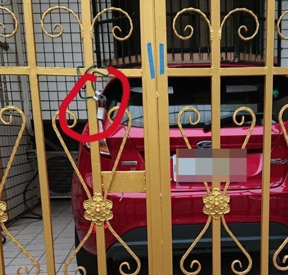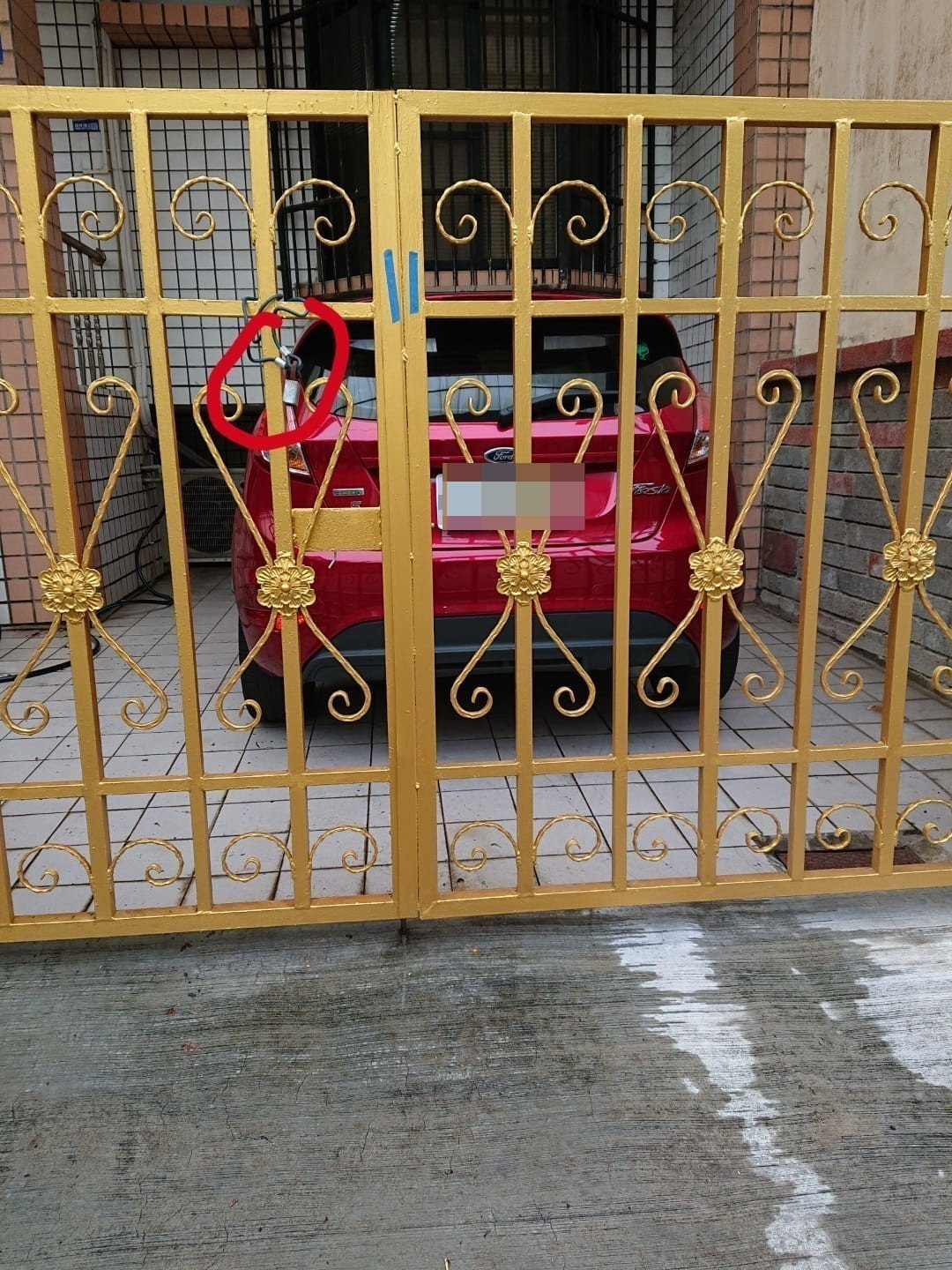 ▼他直接把鐵門用鎖鏈綁住,就算車主回來也無法把車開出來,要讓他自己體會這種糟透了的感覺。