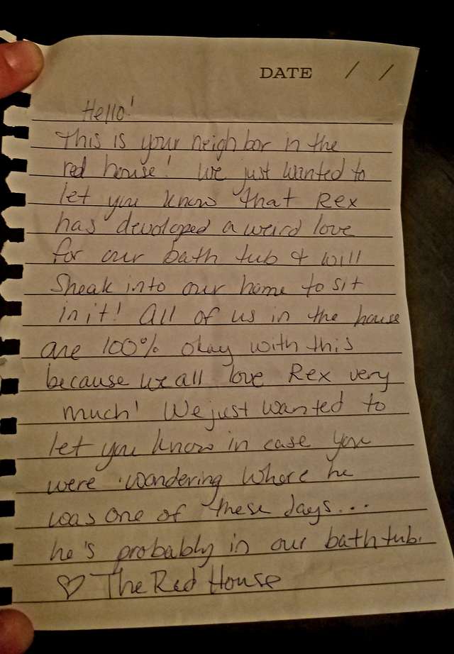 ▼上面寫著「哈囉!我是這附近紅色房子的鄰居!我們只想告知你家的愛貓已經迷上我們家的浴缸了~牠現在經常會偷跑進來,然後獨自坐在浴缸裡面喔!不過別擔心,我們全家100%歡迎牠來玩~只是想通知你一下,避免你擔心牠走失了。」