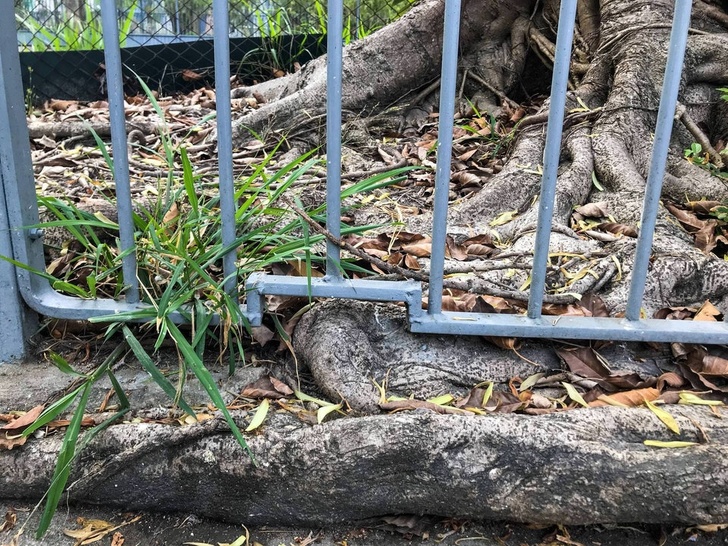▼為了遷就凸出的樹根,鐵欄的設計做了一些改動。