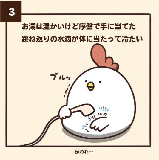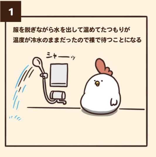 ▼3.「剛開始試水溫的時候,雖然水已經開始變熱,但反彈的水滴到身上還是冷吱吱。(大家能懂吧…)」