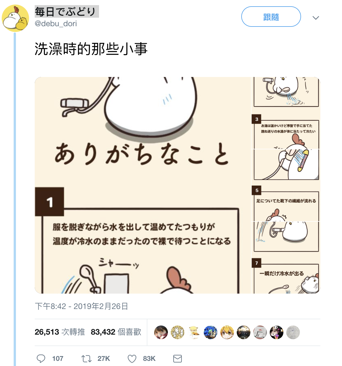 ▼日本插畫家發表《洗澡時那些小事》引發推特網友瘋轉,至今已有2萬多次轉推、8萬多個喜歡。