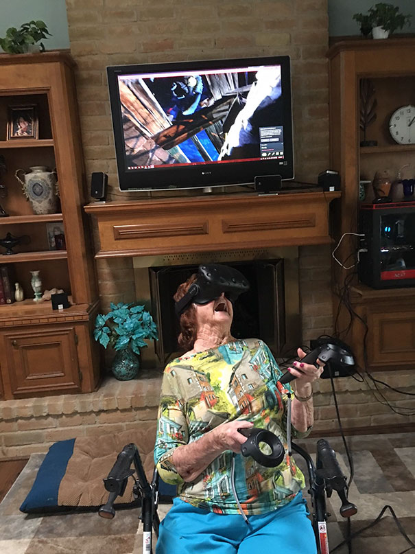 ▼已經96歲的阿嬤第一次玩 VR 的樣子。