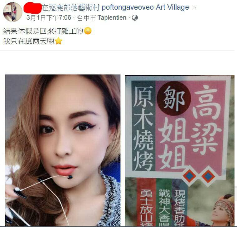 ▼網友後來發現若妍有在臉書上發文,「結果休假是回來打雜工的,我只在這兩天喲」。原來若妍平時在外地打拚,只有假日得空時會回故鄉幫忙招待客人。