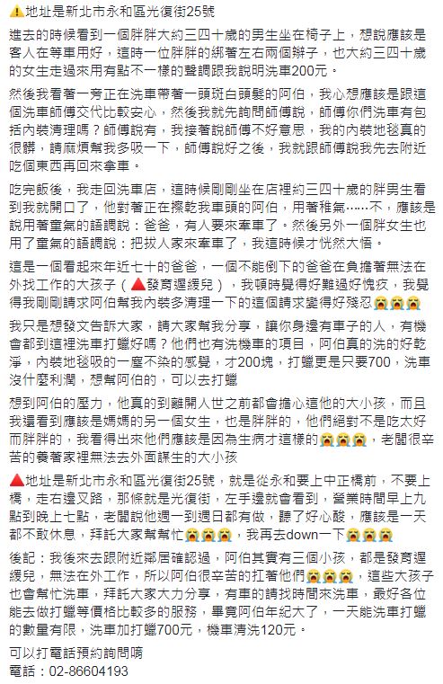 後來原po也向附近的鄰居確認,得知阿伯其實有3個小孩,全都是發育遲緩兒,無法在外工作。看到洗車店每日都有營業,原po也推測是老闆為了能養活全家人,應該是一天都不敢休息。他最後也呼籲有洗車需求的民眾,可以來到這家位於「新北市永和區光復街25號」的洗車店,用行動支持阿伯一家人!