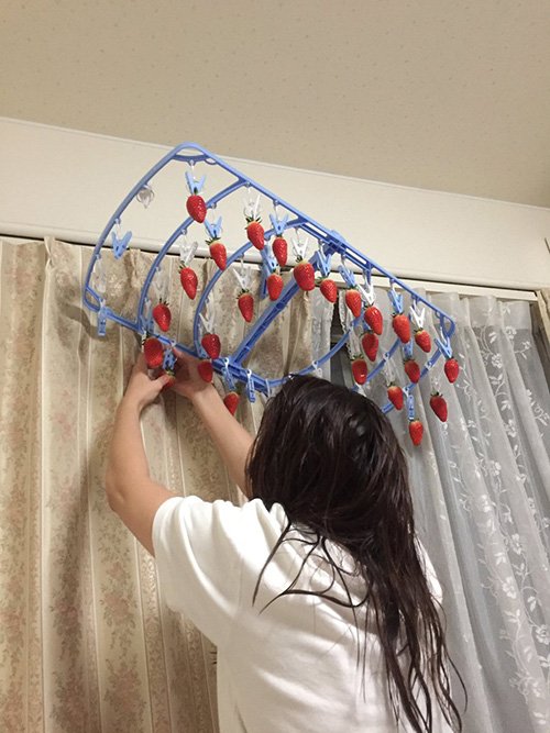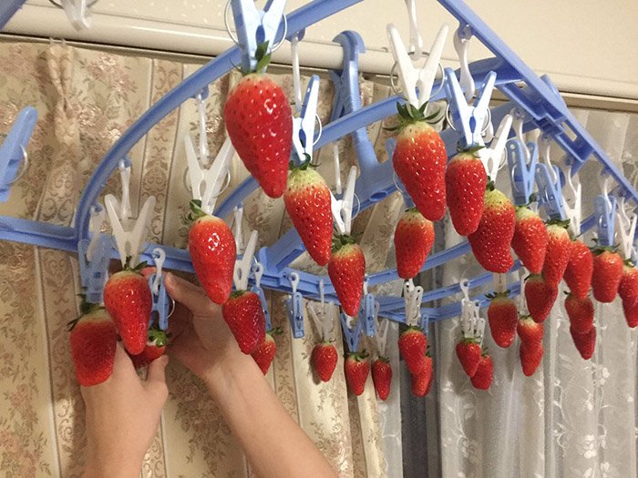 ▼結果他的女友突發奇想,用曬衣夾在家中曬起了草莓,表示「這樣就可以實現採草莓啦!」