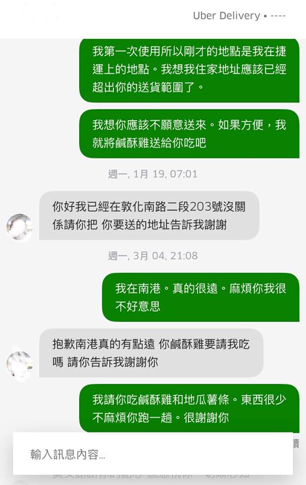 ▼身為攝影師與芳療師的「小姐非常有事」在個人粉絲團分享了這段經歷,原來3月4日時她第一次用 UberEats 叫鹹酥雞,原本盤算是自己到家時司機也剛好送達,卻因為初次使用該系統,不曉得訂單送出前是不會與訂購人確定送餐地點的,下單之後也無法取消。眼見司機在東區敦化南路二段,自己的家卻在南港,不好意思勞煩對方跑那麼遠,「乾脆把晚餐送給司機大哥吃。」