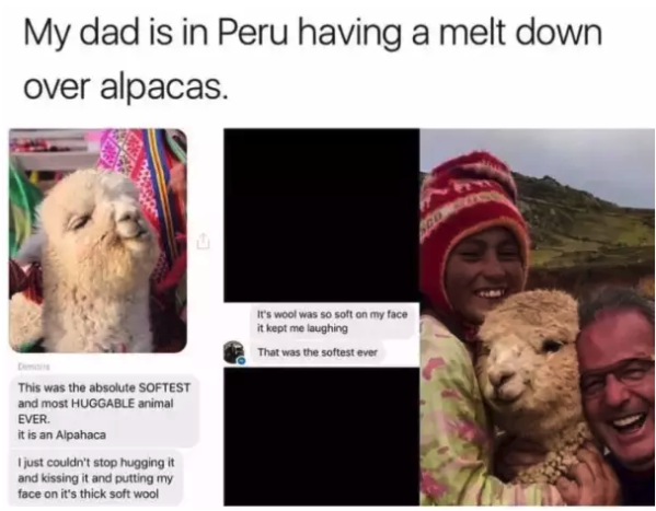 ▼我爸在秘魯遇到了一隻羊駝,這讓他完全被融化了。