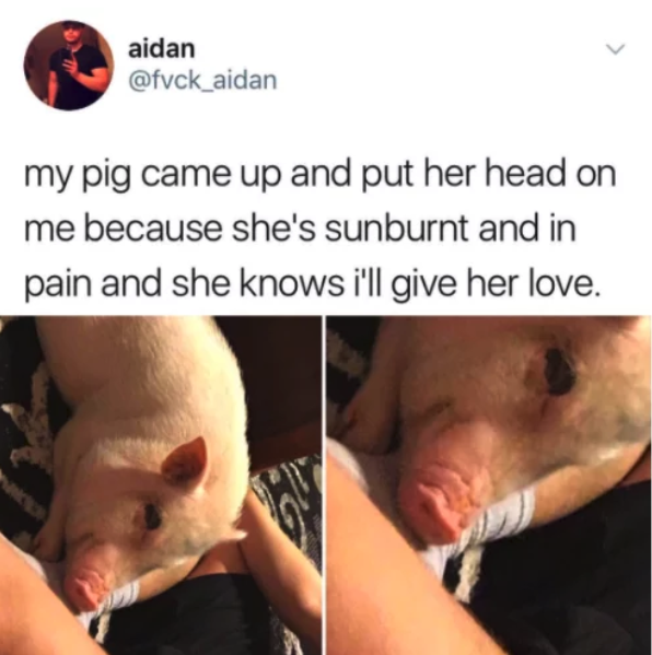 ▼我養的家豬跑向我,將牠的頭放在我身上,因為牠曬傷了很不舒服,而牠知道我會給牠滿滿的愛。
