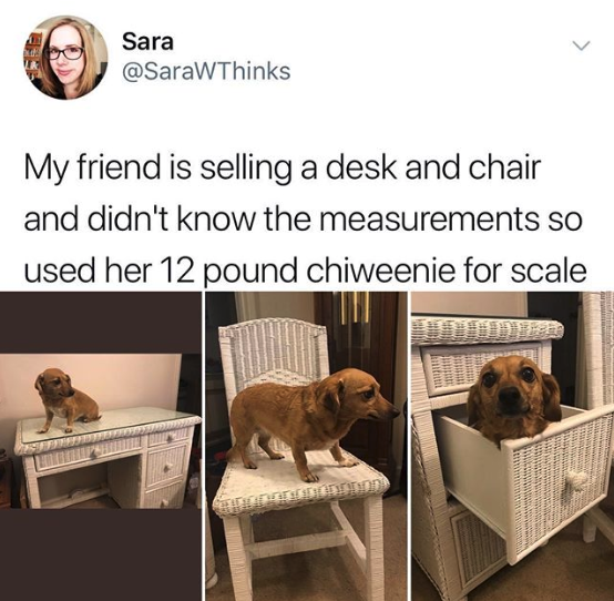 ▼我朋友想要出售家裡的書桌和椅子,卻不懂得該怎麼測量,於是用了家中約5.4公斤的狗狗來當比例尺。