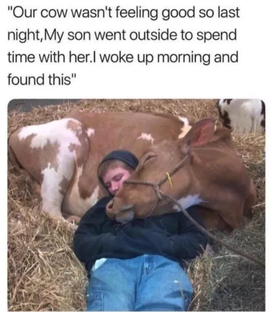 ▼我們家的母牛昨晚就感覺不舒服,於是我兒子出去陪著牠,隔天我起床看到了這樣的畫面。