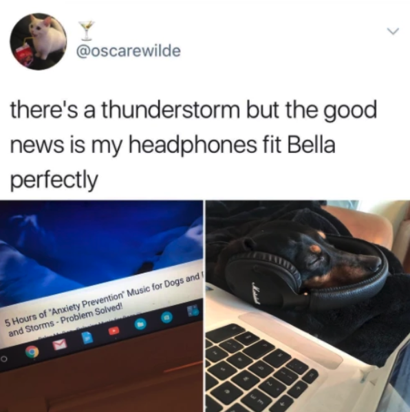 ▼外面不斷在打雷,幸好我的耳機剛好適合狗狗的頭型,我正在給牠聽安撫音樂。