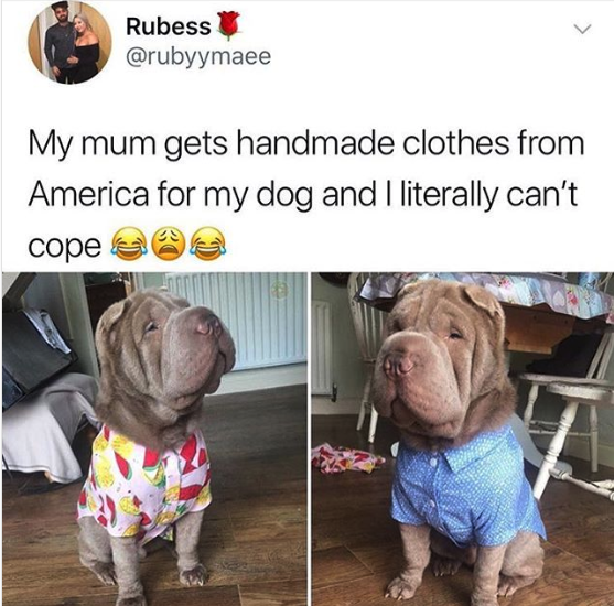▼我媽從美國帶了一些狗狗的手工衣服過來,讓我幾乎無法應對。