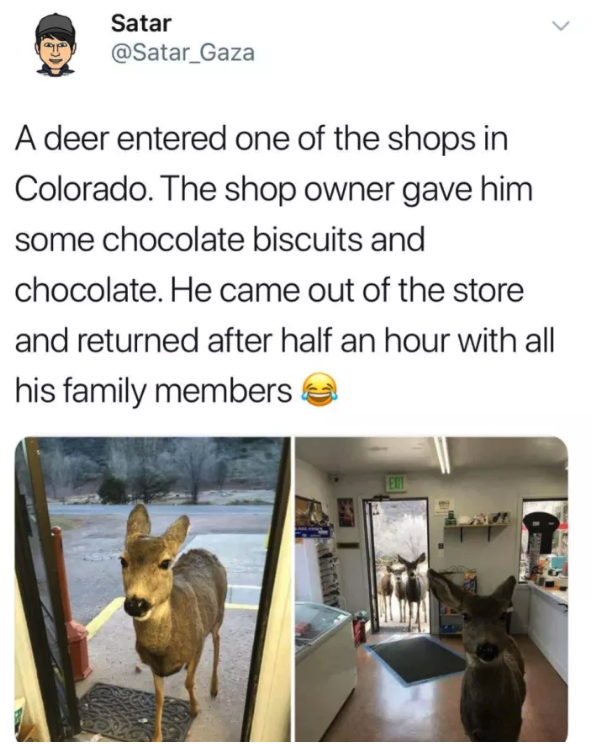 ▼一隻鹿走進了科羅拉多州的這家店,老闆給了牠一些熱巧克力餅乾和巧克力。他離開之後隔了一小時半又來了,這次牠帶了全家的成員一起過來。
