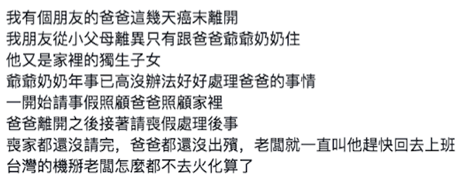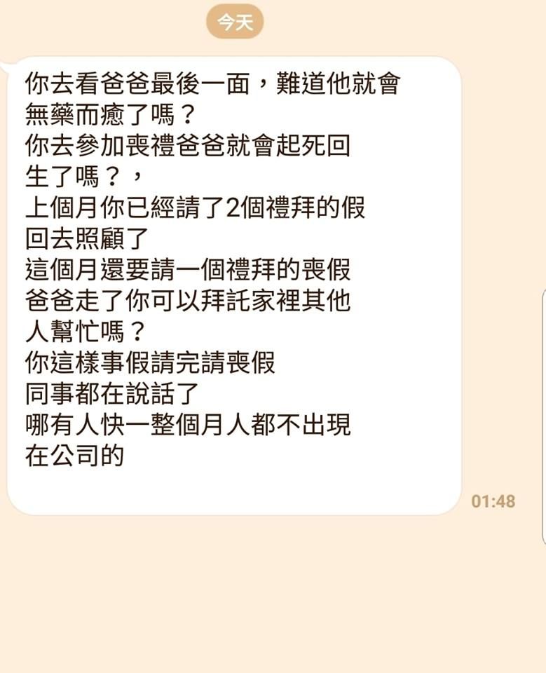▼原PO的友人在父親走後,很堅強地要幫爸爸處理好後事,但是沒想到惡老闆居然在爸爸都還沒出殯的時候,傳了一封要他馬上回去上班的訊息。
