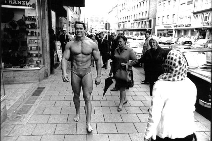 ▼1.1969年時,阿諾史瓦辛格(Arnold Schwarzenegger)只穿著泳褲在慕尼黑的街道上穿行,藉此宣傳他的健身房。