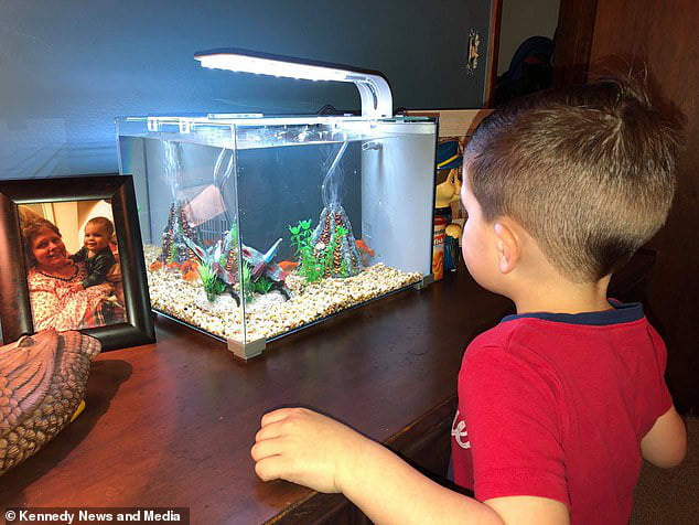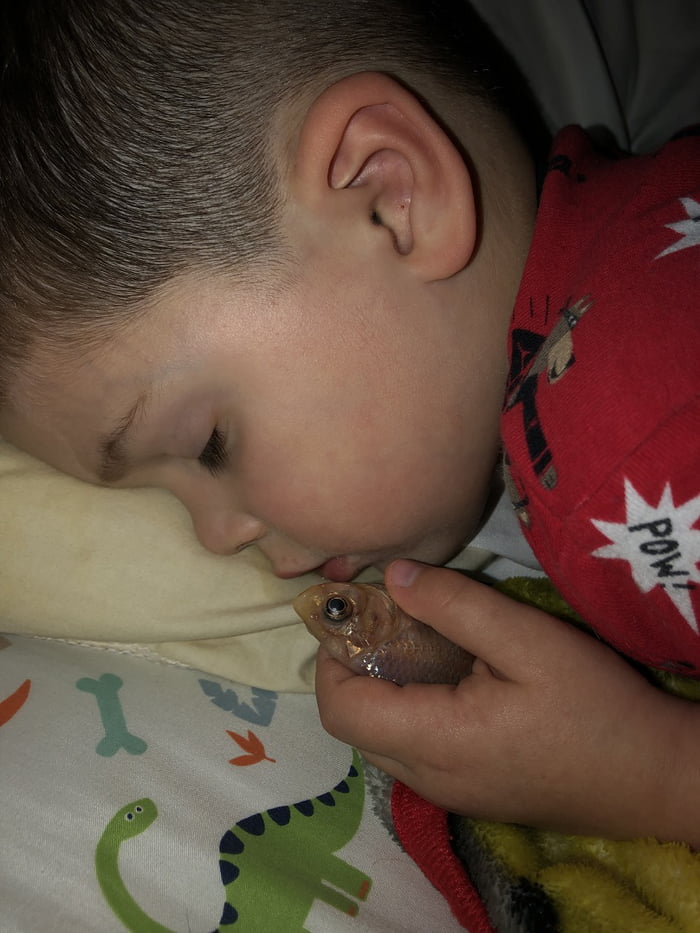 ▼今年2月底,媽媽Tori發現魚缸中的金魚Nemo不見了。她非常吃驚,最後看到Everett抱著金魚睡得正香。因為離開水太久,可憐的Nemo已經離開了世界。Tori知道兒子很喜歡Nemo,不知道該怎麼跟兒子說這件事。