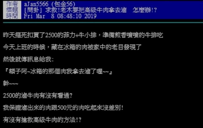 ▼原來是藏在冰箱中的高級牛肉,被媽媽發現了!「額子阿~冰箱的那個肉我拿去滷了喔~~」看到訊息後,原PO內心忍不住哀號飆了一句髒話。「2500的滷牛肉有沒有看過?」、「我保證滷出來的肉跟500元的肉吃起來沒差別!」無奈之下,他只好抱著一絲希望,詢問眾網友還有沒有什麼方法,能搶救他心愛的高級牛肉…