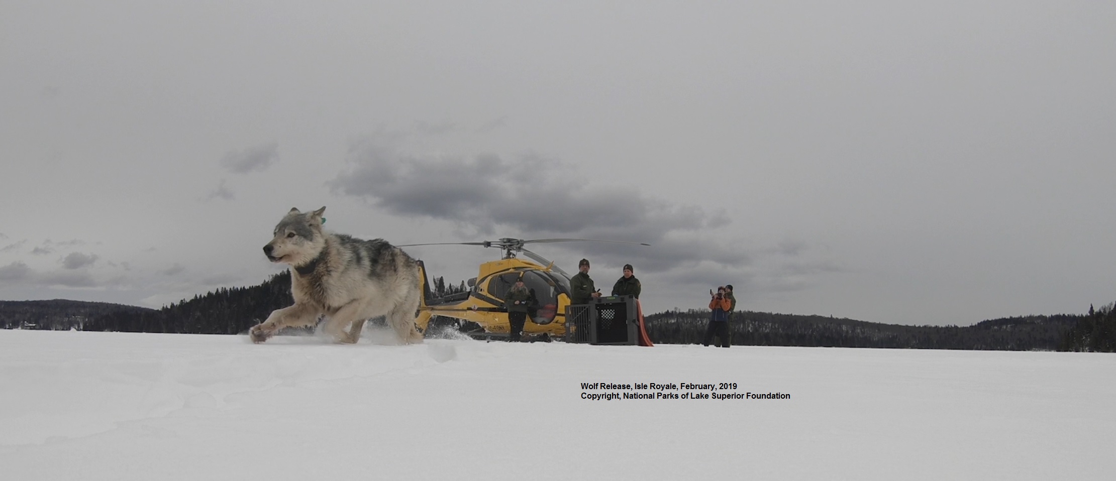 ▼2019年2月,安大略省自然林業資源局(Ontario Ministry of Natural Resources and Forestry)利用直昇機載送一匹母狼與三匹公狼,將牠們投放至皇家島。