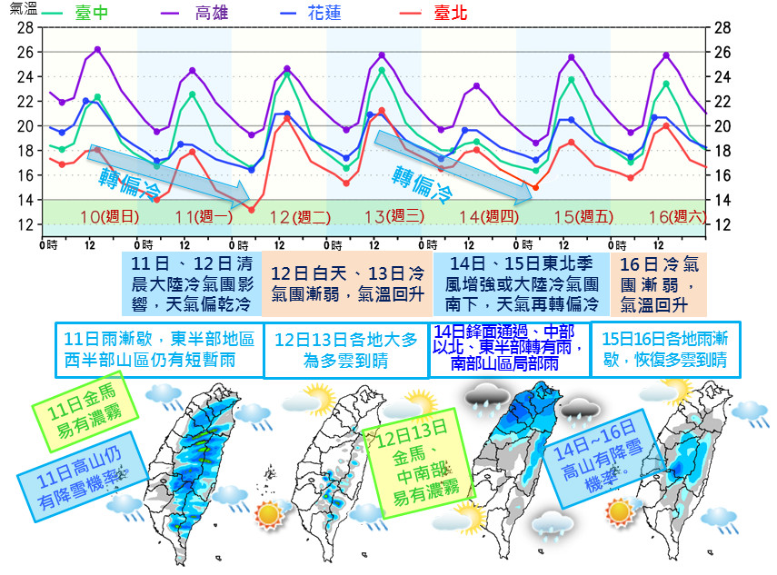 ▼氣象局也預測,從11號開始北部及東北部的氣溫介於約攝氏18度,東部及東南部約19至21度,中南部約22至24度;低溫方面,北部及東北部約13、14度,其他地區16至18度,體型大家要注意保暖。也因為冷氣團的輻射冷卻作用,北部沿海空曠地區低溫可能降至12、13度。