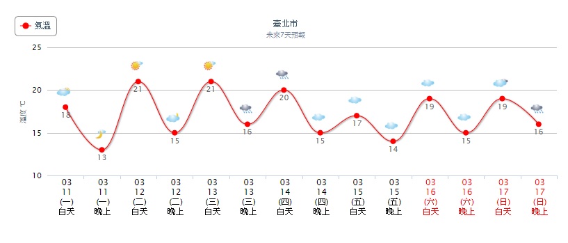 ▼連續有鋒面、冷空氣來襲,未來一週必須做好天氣變冷的準備!以下就是未來一週北市的溫度趨勢圖: