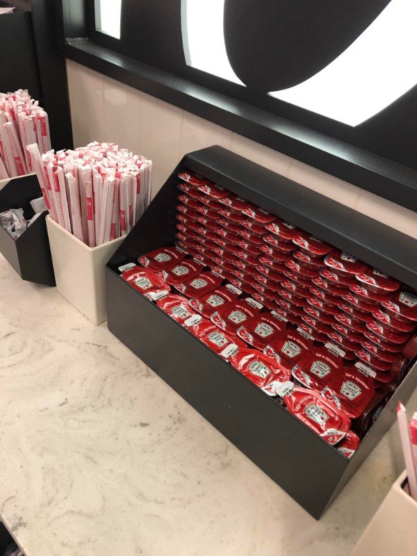 ▼擺放得超整齊的快餐店番茄醬和吸管。