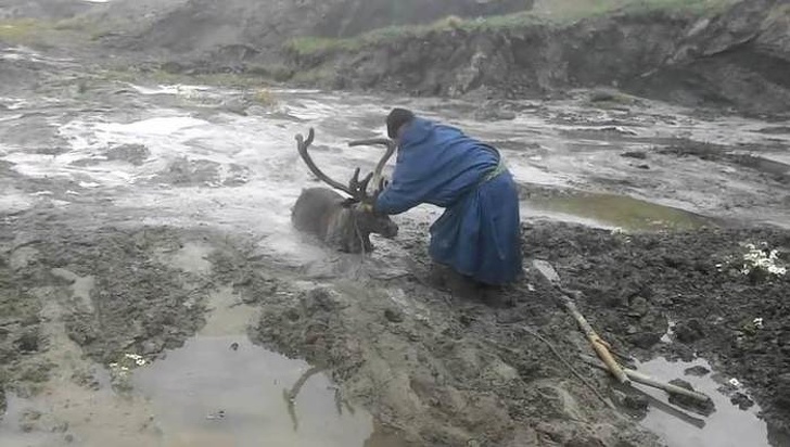 ▼他為了拯救陷入沼澤的鹿,不惜鋌而走險進入沼澤區。