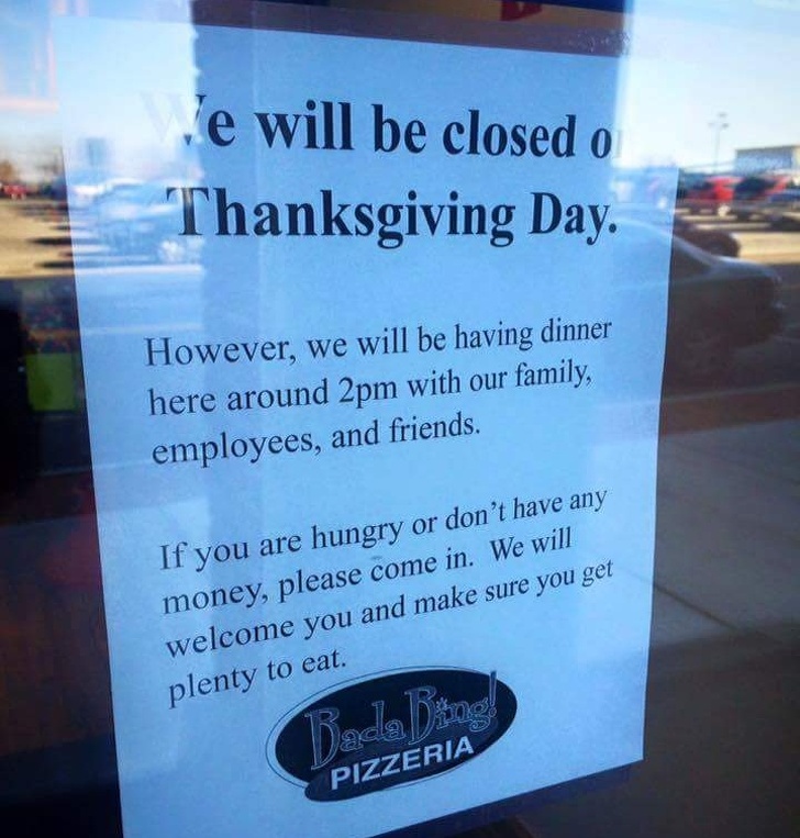 ▼「本店在感恩日當天歇業,不過我們會在下午兩天舉辦聚餐,如果你感到飢餓,或沒錢吃飯的話,歡迎你出席,我們保證會讓你吃到飽。」