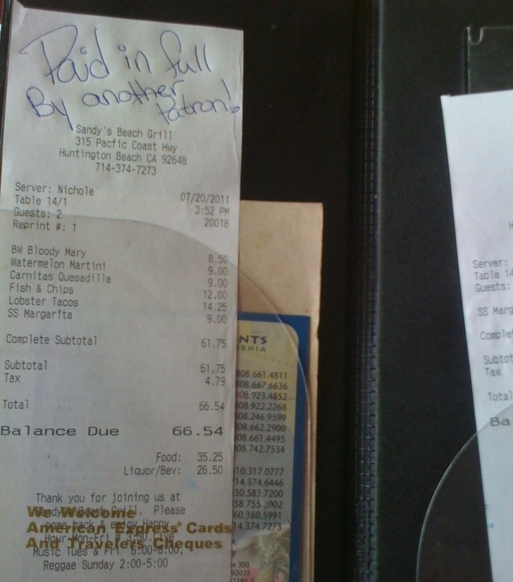 ▼他帶著老婆和孩子在餐廳慶祝生日時,有陌生人悄悄幫他結帳了。
