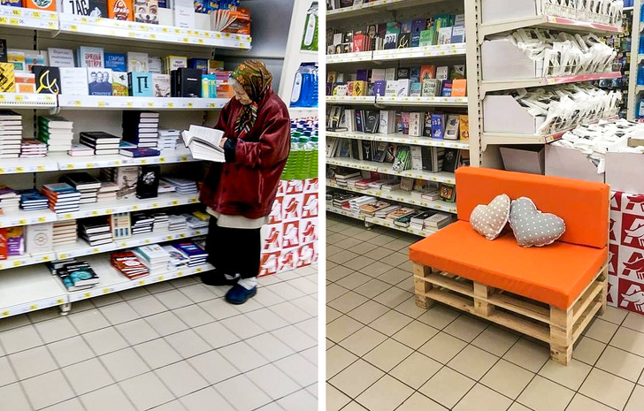▼15年來這個老婦人每天都會來店裡看書,於是書店老闆為她準備了一張椅子。