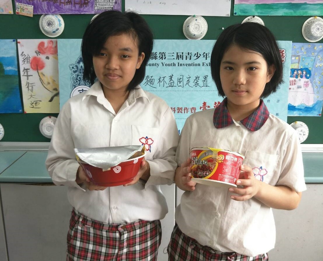劉珈儀、胡欣羽聯手發明的「泡麵杯蓋固定裝置」,成功在「台東縣青少年發明競賽」獲得金牌獎及特別獎,還有獎金1萬元!評審看到她們的參賽作品都覺得訝異,因為她們居然只是用了一小片的紙膠帶而已!