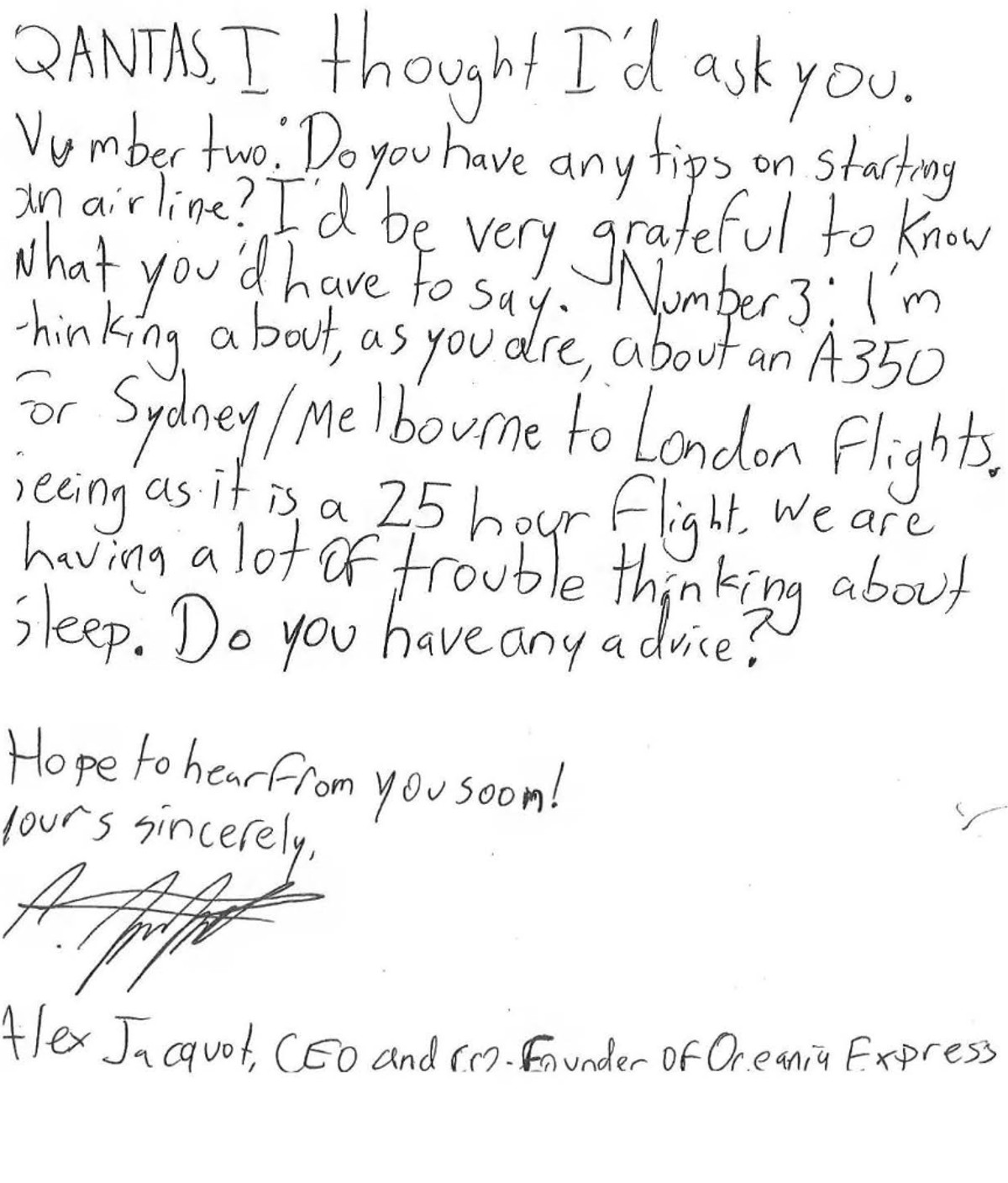 ▼「我寫這封信,是想向您請教三個問題:1. 現在學校放假,我有更多時間工作,但我不知道可以做什麽。您有什麼建議呢?您是澳洲航空的CEO,我想我可以向您請教這個問題。2.您對於創立一間航空公司有什麽秘訣嗎?如果您告訴我的話,我將不勝感激。3.我在想,A350從雪梨/墨爾本飛到倫敦的25個小時的航程裡,我們對於睡眠問題有很多疑問,您能給我們一些建議嗎?