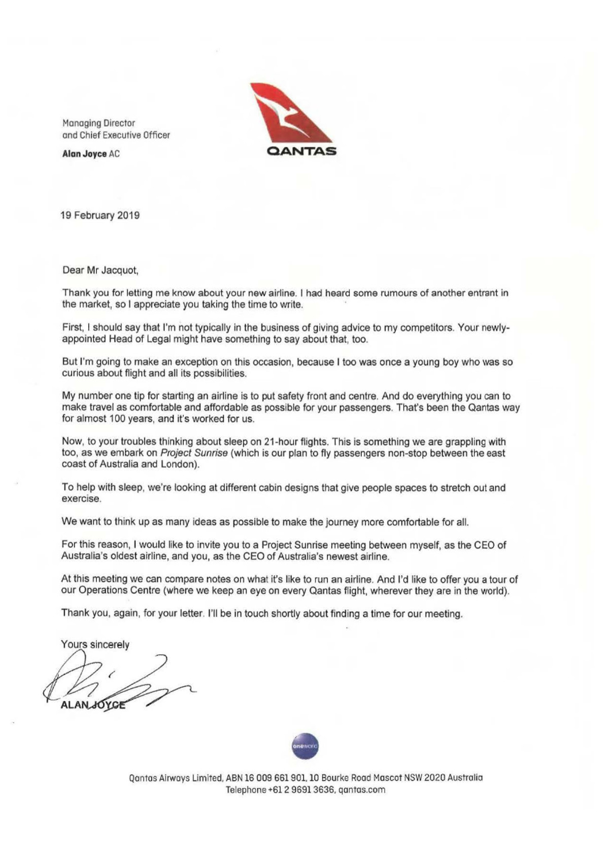 因為這個原因,我希望邀請您來參加日出計畫的會議,這是一次我-澳洲航空的CEO,跟您-澳洲最新的航空公司CEO之間的會議。