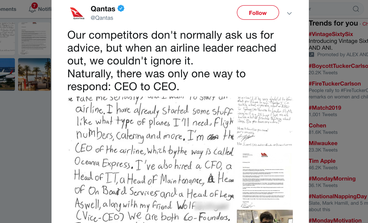 ▼澳洲航空公司「QANTAS」在推特上公開了一封特別的信,並說:「競爭對手通常不會跟我們尋求建議,不過當一間航空公司的領導人主動詢問時,我們也不能視而不見。我們只能平等回應:這是CEO與CEO之間的對話。」