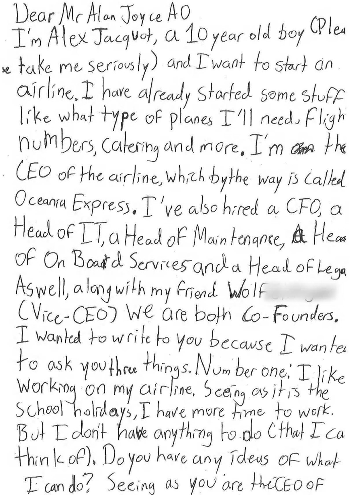 我叫Alex Jacquot,是一個10歲男孩(請認真看待這封信)。我長大後想開一間航空公司。我已經開始準備,並考慮好需要哪種飛機、班機號碼、食物等問題。我是這間公司的CEO,公司名為『大洋運通』(Oceania Express)。我還雇用了一個財務長,一個IT領導人,一個維修負責人,一個機上服務負責人,還有法務負責人。我跟我朋友(副CEO)是共同創辦人。」