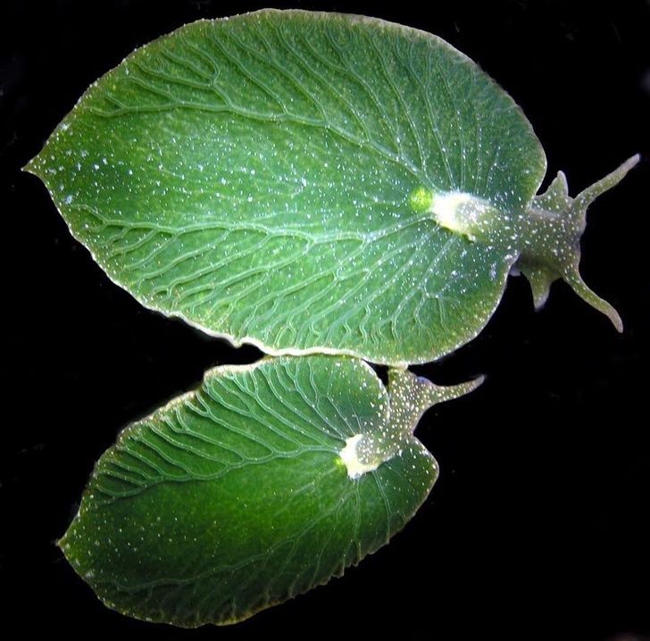 ▼這種看起來像一片葉子的蛞蝓,可以連續9個月不用進食,因為牠可以像植物一樣進行光合作用!