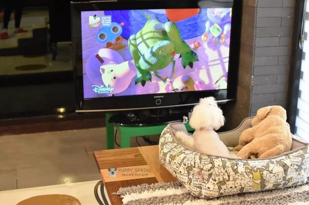 ▼PM 17:00 - 18:00是看電視、自由活動時間,老師換打開電視,讓狗狗可以好好欣賞一下最近新電影在演什麼,雖然牠們可能不能理解內容,但是電視的光和音效就能讓牠們當個電視兒童了~