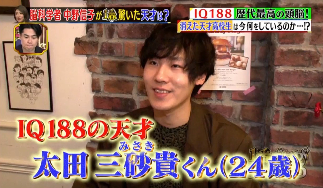 2019年03月15日日本一名驚世天才智商比偉人霍金、愛因斯坦還要高,但是現在卻是一名無業青年?24歲的太田三砂貴是「日本史上最高智商(IQ 188)天才」,16歲就可以創作出交響曲及大師級繪畫作品,但是他最近上節目說出現況卻讓大家都傻眼了…