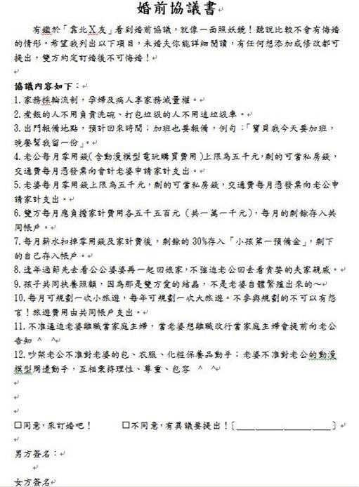 ▼這份「婚前協議書」讓其他網友們紛紛讚嘆:「條理分明,好女人不娶嗎?簽吧!」、「這才是真正所謂的男女平等」、「這麼罕見有腦的老婆,必娶啊!」、「跪求電子檔~」、「可以借分享甚至借來用嗎?XD」。