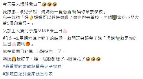 2019年03月19日成為媽媽之後,總是會為了孩子讓自己在不知不覺中變得越來越無所不能!一名女網友在臉書《爆怨公社》中po文表示,自己胯下海口要幫5歲兒子做一隻恐龍當做生日禮物,兒子聽了非常開心,自己卻是辛苦了一整晚的時間將恐龍做出來,事後將成果照片放上網路時,也讓網友紛紛大讚她「為母則強」!