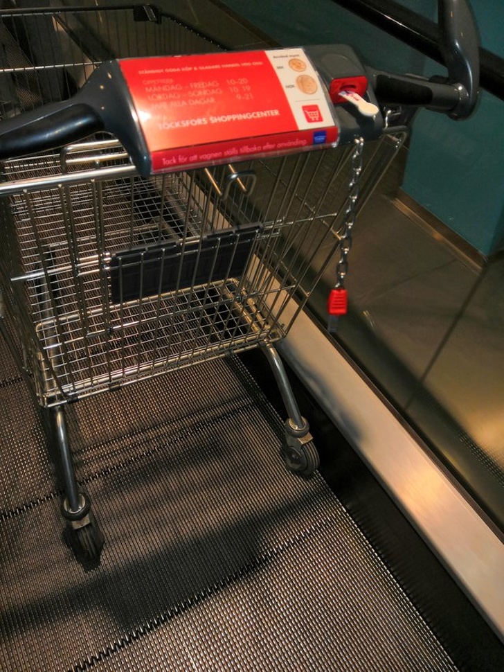 ▼瑞典的購物車輪子上有磁鐵,因此不會直接從手扶梯滑下去。