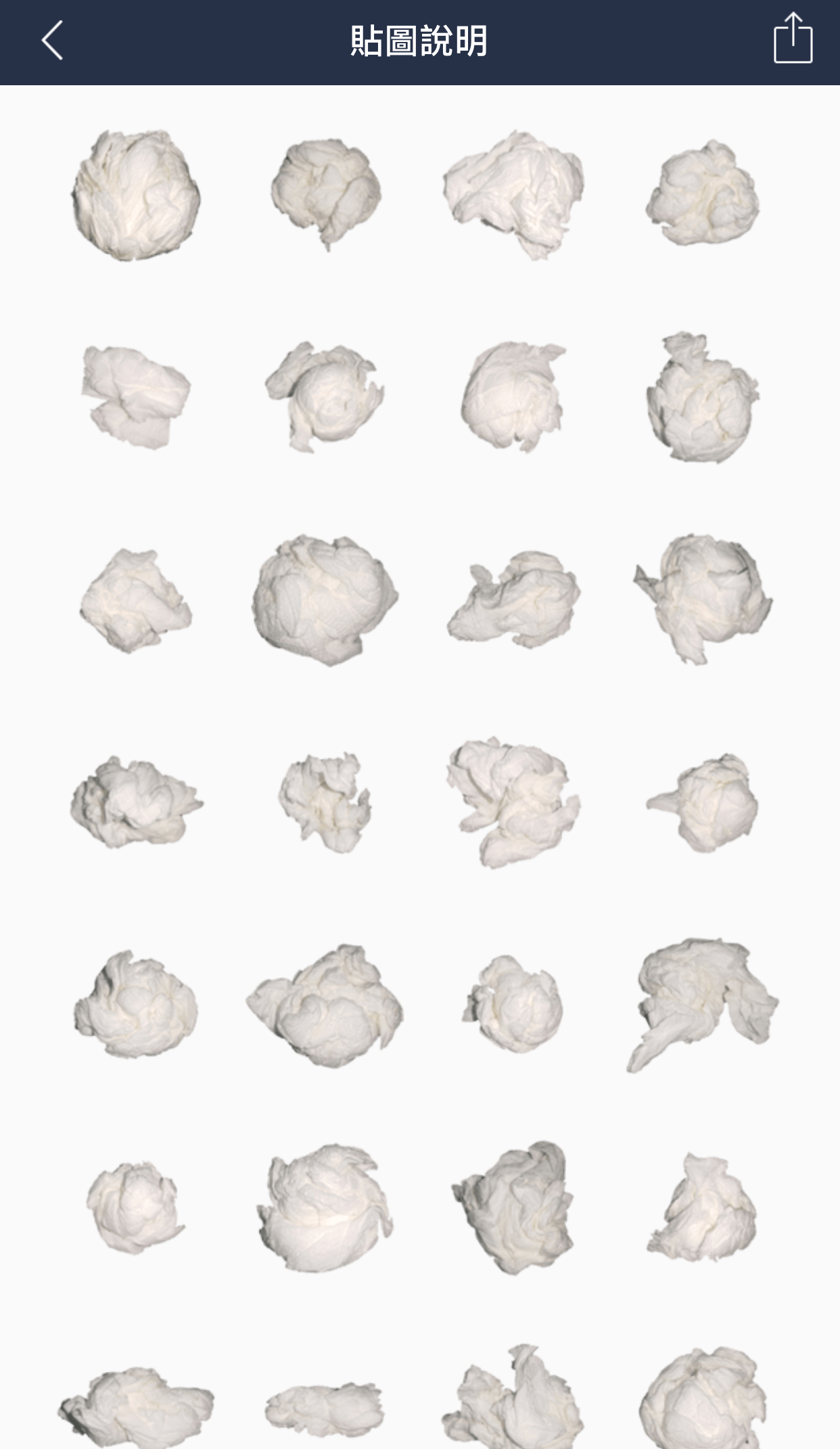 ▼網友在LINE貼圖裡發現名為「我是衛生紙」的搞怪貼圖,介紹裡寫著:「我是衛生紙,渺小而偉大的存在。」貼圖內容就真的只是一張張被揉皺的衛生紙!