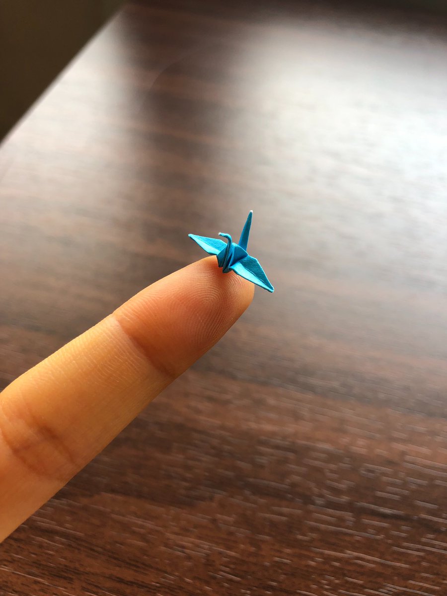 ▼原po還貼出了妹妹製作的紙鶴,這個藍色的紙鶴只有指腹大小,製作起來很不容易。